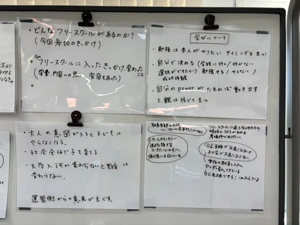 「どんなフリースクールがあるのか」「入学のきっかけや変化」などのテーマで話し合いが行われました。